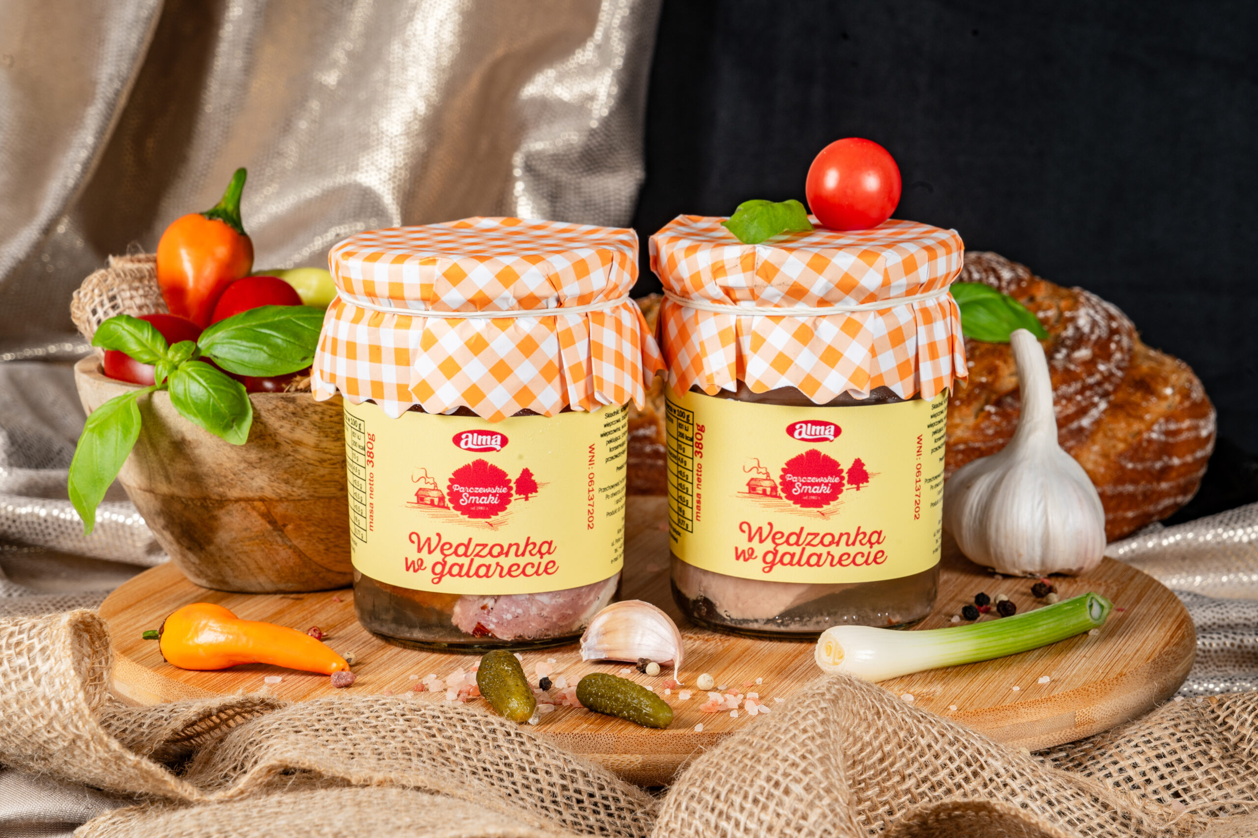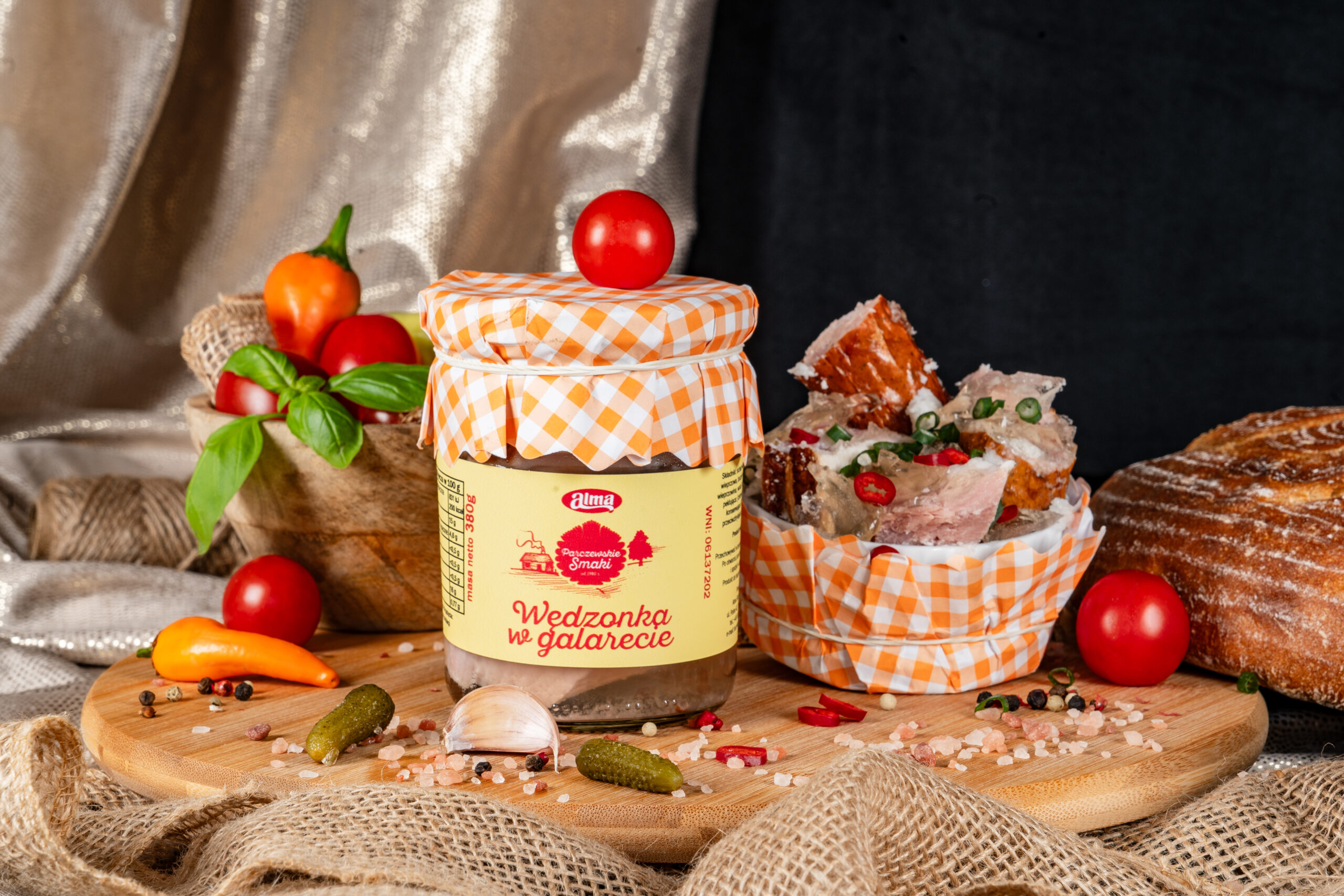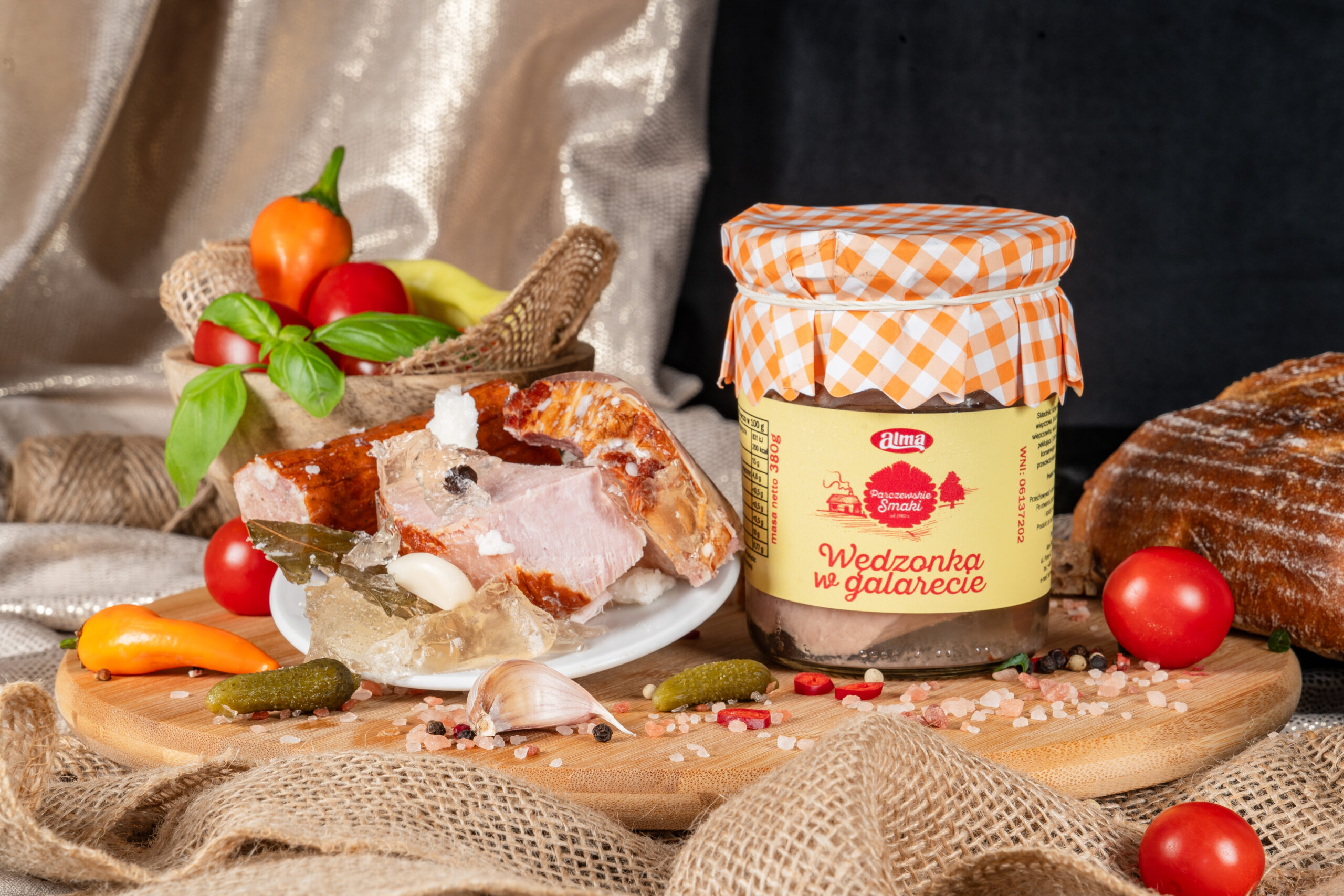 Ręcznie przygotowana kompozycja najwyższej jakości wędzonych mięs wieprzowych: schabu, karkówki, boczku i szynki – delikatnie doprawiona i zamknięta w klarownej, aromatycznej galarecie. Tradycyjna przekąska, która łączy w sobie intensywny smak. Idealna na zimno – do pieczywa, chrzanu lub jako element półmiska mięs.