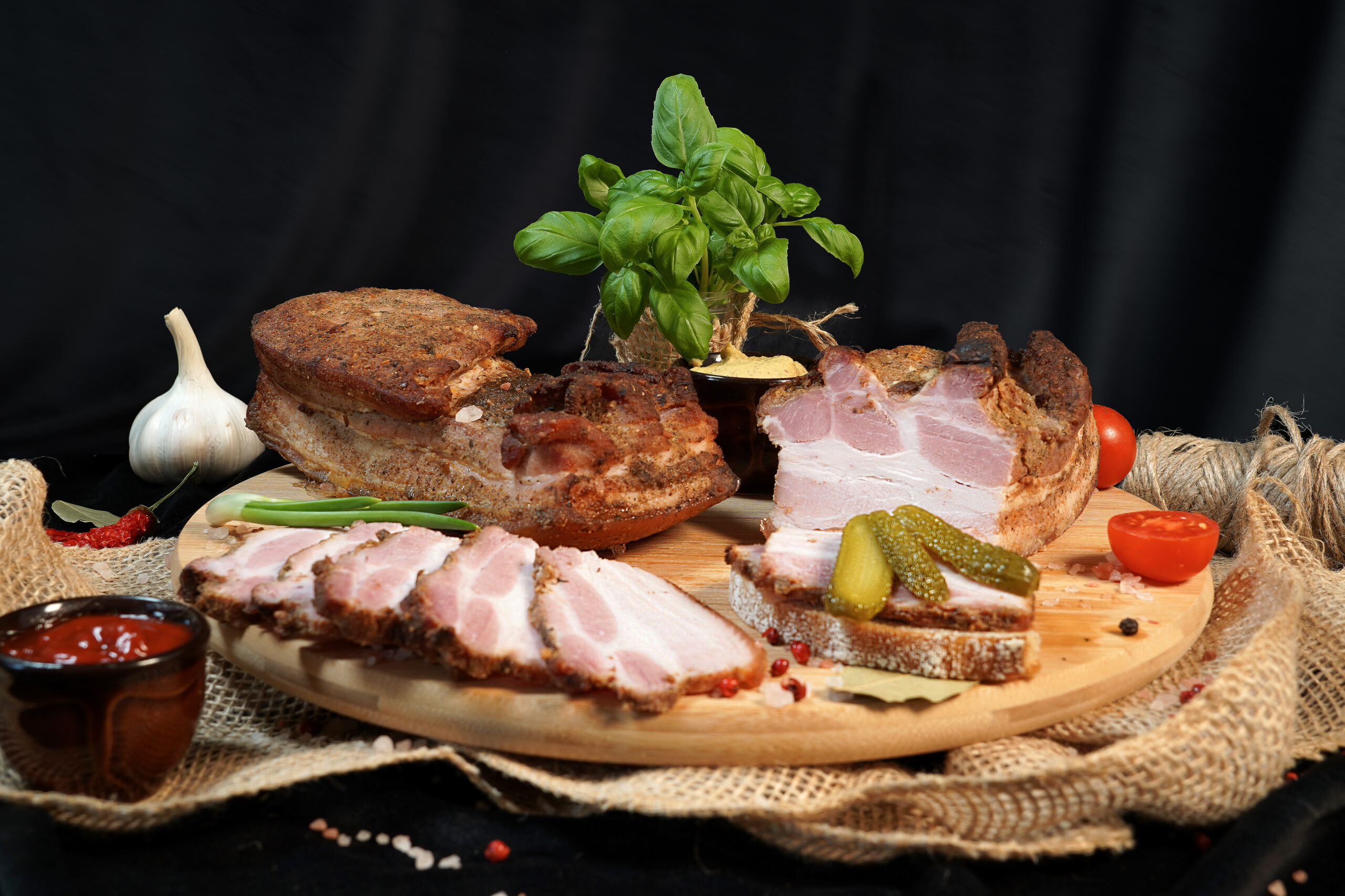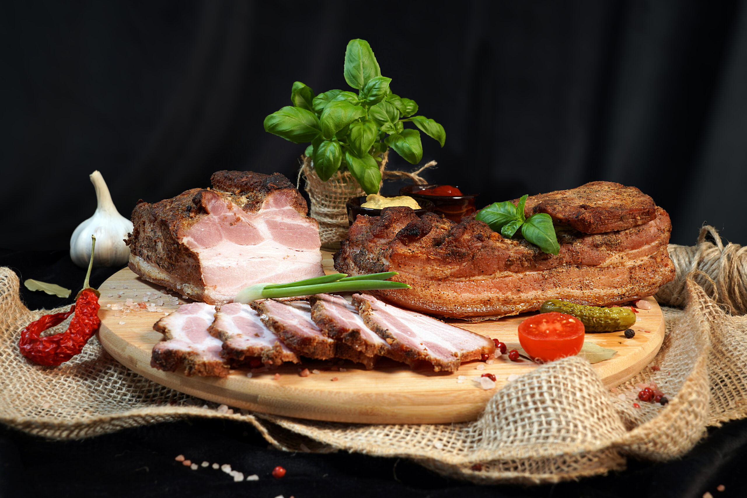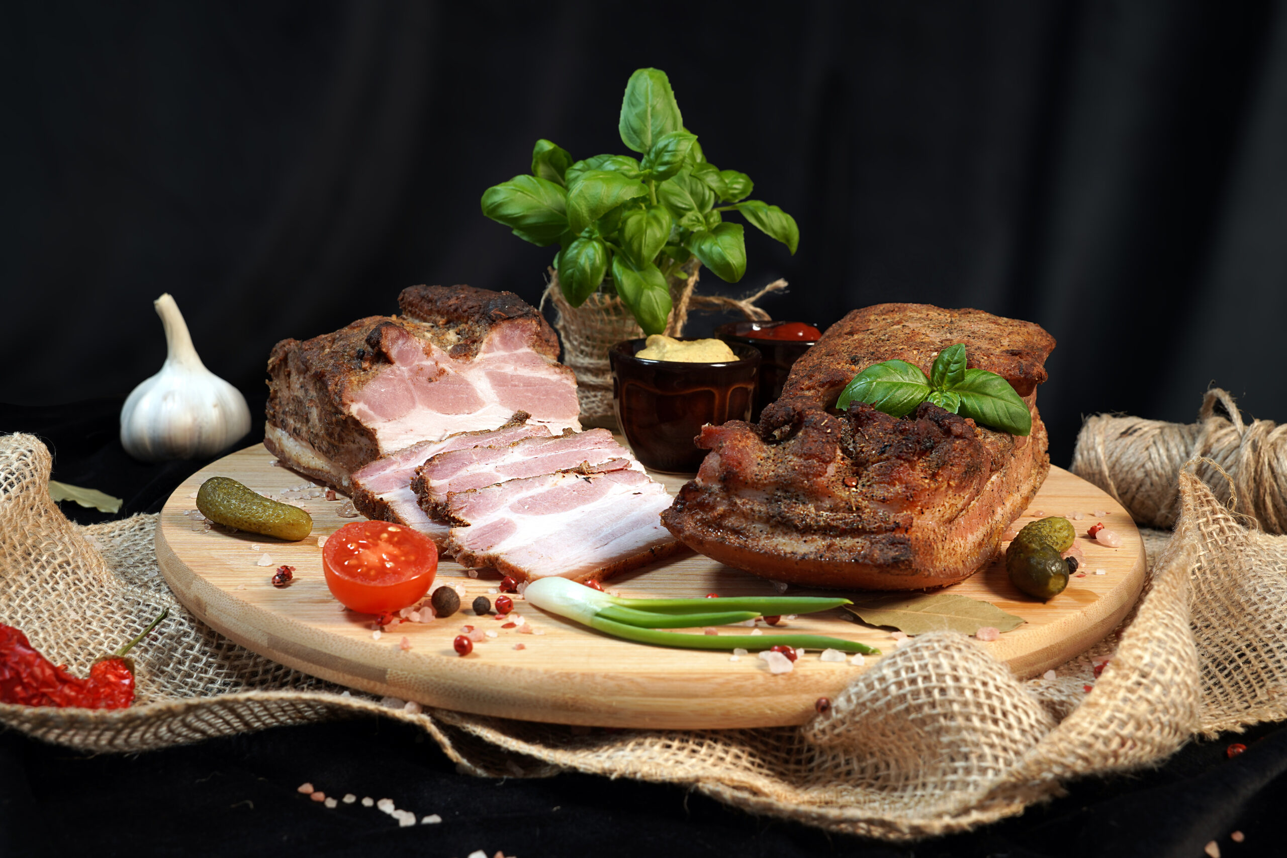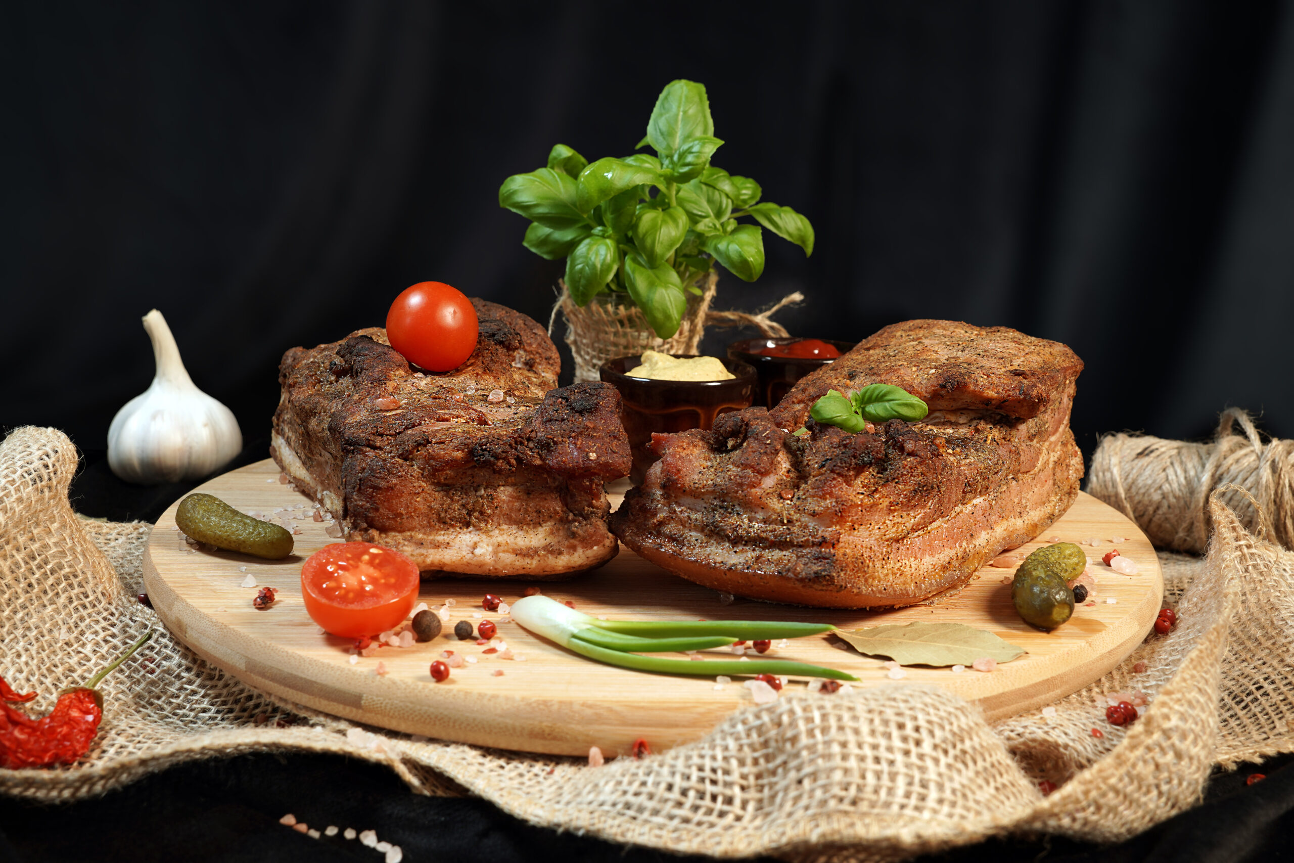 Nasz boczek pieczony to połączenie wysokiej jakości mięsa i przypraw, które podkreślają jego wyjątkowy charakter. Każdy kawałek starannie marynowany w aromatycznym zestawie ziół- czosnku, majeranku, pieprzu oraz delikatnej papryki- a następnie wolno pieczony, aby uzyskać idealne połączenie chrupiącej skórki i soczystego wnętrza.